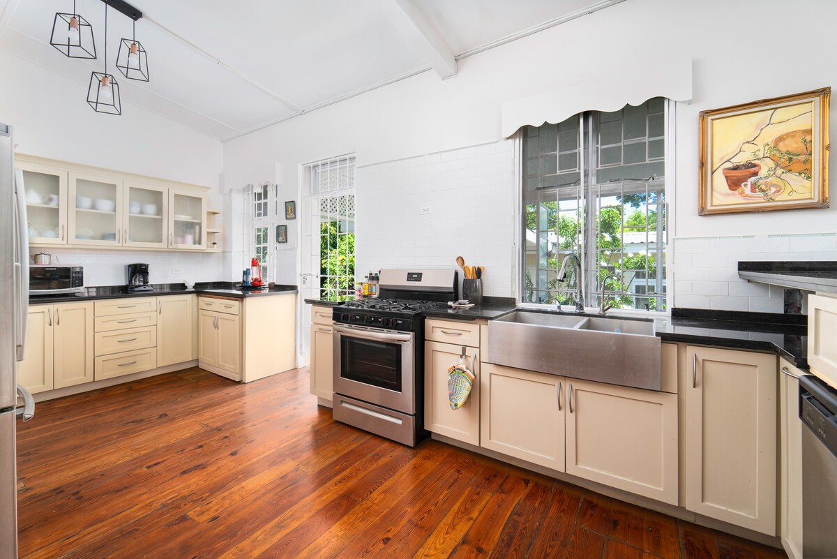 Artistically renovated with strong older bones this stylish place to stay is perfect for group trips with 2 King beds and 1 Queen bed. Two spaces to gather and watch tv, as well as a large dining table for group dinners. Close to St. Lawrence Gap, nice south coast beaches, affordable supermarket "Popular" and Oistins fish fry - approximately less than 5 -10 minutes by car. Incredible moments on the back patio of one of the bedrooms every morning and evening to see beautiful parrots flying by.