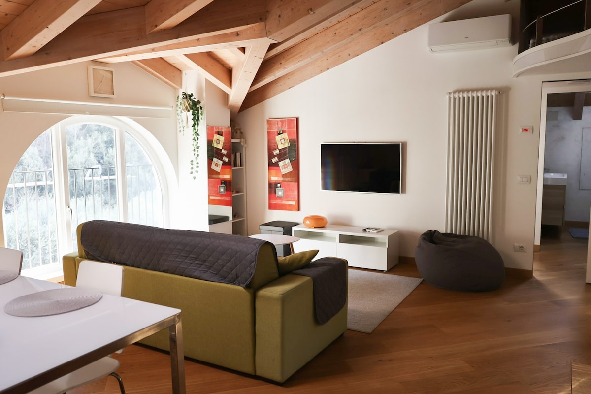 A romantic attic with antique furnishings. Lovely terrace for dining and enjoying the view. Located in a beautiful, very sunny, and quite area of Riva del Garda, the apartment offers a terrace overlooking mountains, a bedroom, a bathroom, a kitchenette and free Wi-Fi. Free storage for bikes or equipment.