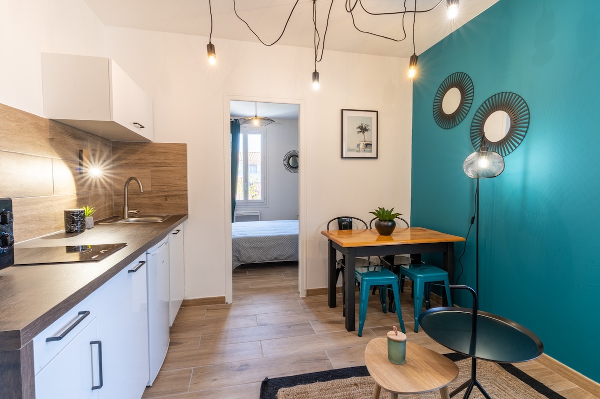 🔹jolie petit appartement,vous êtes situé au premier étage d’une magnifique villa méditerranéenne divisée en plusieurs appartements . 🔹jardin de 70m2 ombragé avec barbecue 🔹Le quartier est très calme et vous êtes à 200 mètres de la plage ainsi que la place principale du village avec tout ses restaurants et commerces