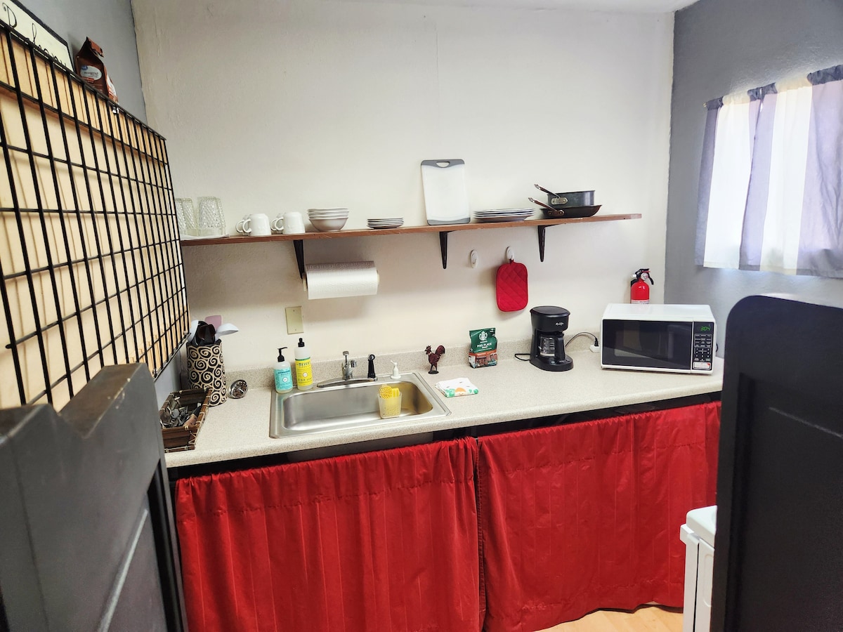 Welcome to The Bitty Bungalow, a charming tiny guest studio, perfect for those seeking cozy simplicity with all the comforts of home. It features a well-supplied mini kitchen, a deluxe redesigned bathroom, and a mini washer and dryer. My grandmother's antique roll-top desk and grandfather's original oil paintings complete the home's rustic look. While ideal for a solo or couple getaway, The Bitty Bungalow sleeps up to 6 guests, allowing families or groups to enjoy a modest retreat in the pines.