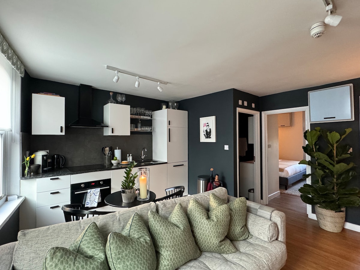 A brand new, lovely 1-bed apartment with European king sized bed and 400 thread count sheets, black out curtains an air conditioning throughout. Fully equipped kitchen with Grind coffee machine and complementary organic compostable coffee pods. 4K 40" Smart TV and super fast fibre-optic wi-fi.
