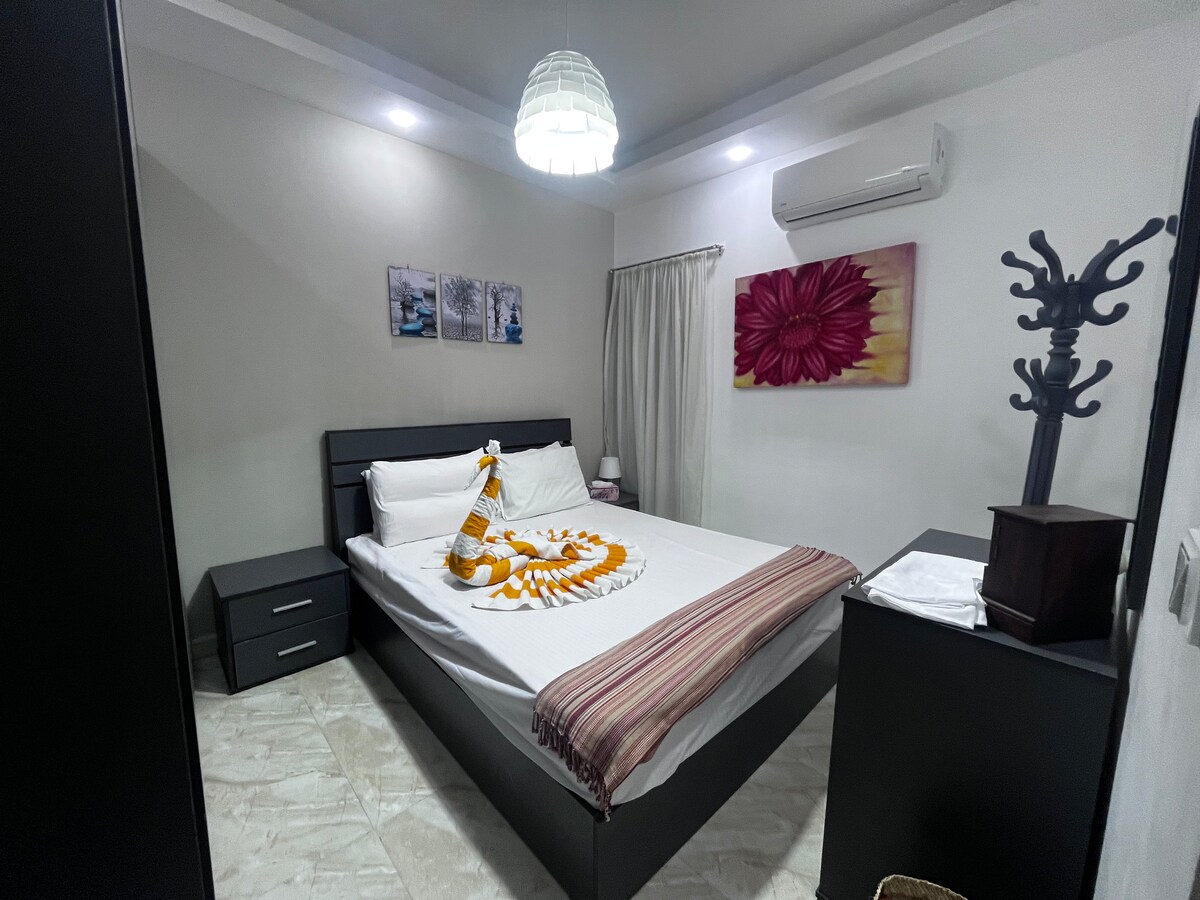 nouvel appartement merveilleux, calme et entièrement équipé , au View Resort, à Hurghada. Le bon endroit pour passer des vacances calmes et confortables où vous pouvez vous réveiller avec vue sur la belle mer et la merveilleuse piscine et profiter d'un merveilleux moment dans les jardins privés du complexe. L'appartement est très agréable et adapté aux grandes familles ou à quatre voyageurs Les voyageurs ont accès à la piscine et à la plage. J'ai vraiment la certitude que vous passerez les meilleures vacances de tous les temps.