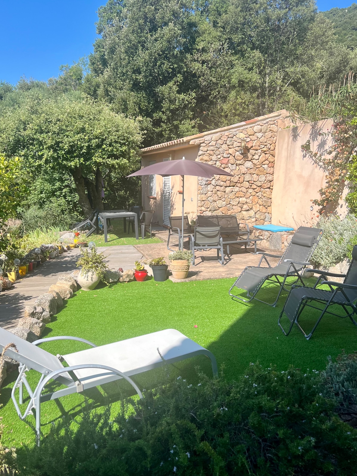 Découvrez notre havre de paix (3 pers.) proche départ GR20, d'environ 30 M2, très calme, avec cuisine équipée (plaque vitro-céramique 2 feux; frigo/congélateur ; four pyrolyse + 2 cafetières (filtres+Nespresso); micro ondes; cocotte minute) ; plancha électrique… Séjour/cuisine ouverte + canapé +TV +alcôve lit double + mezzanine matelas 2 places+douche à l'italienne & WC + terrasse & salon de jardin + accès jardin + parking. (Possibilité draps/serviettes/ torchons en sup. (40€ à régler sur place)