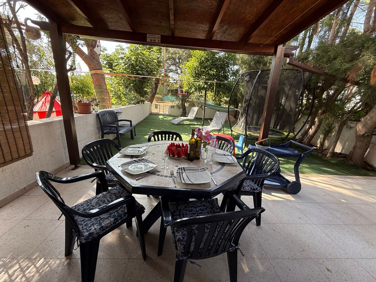 Delightful 2-bedroom villa with private playground - ideal for small families or digital nomads. Mature garden surrounding the villa is home to some birds, and offer natural shade. Ultra fast Internet is covering the garden, so you can work from the terrace, hammock or a secluded balcony. New ACs, Fans, good water pressure, fully equipped kitchen, comfy sofa, BBQ, smart TV, double swing, inflatable pool, trampoline, toys and etc. Beach is only 5 min walk away, close to shops and restaurants.