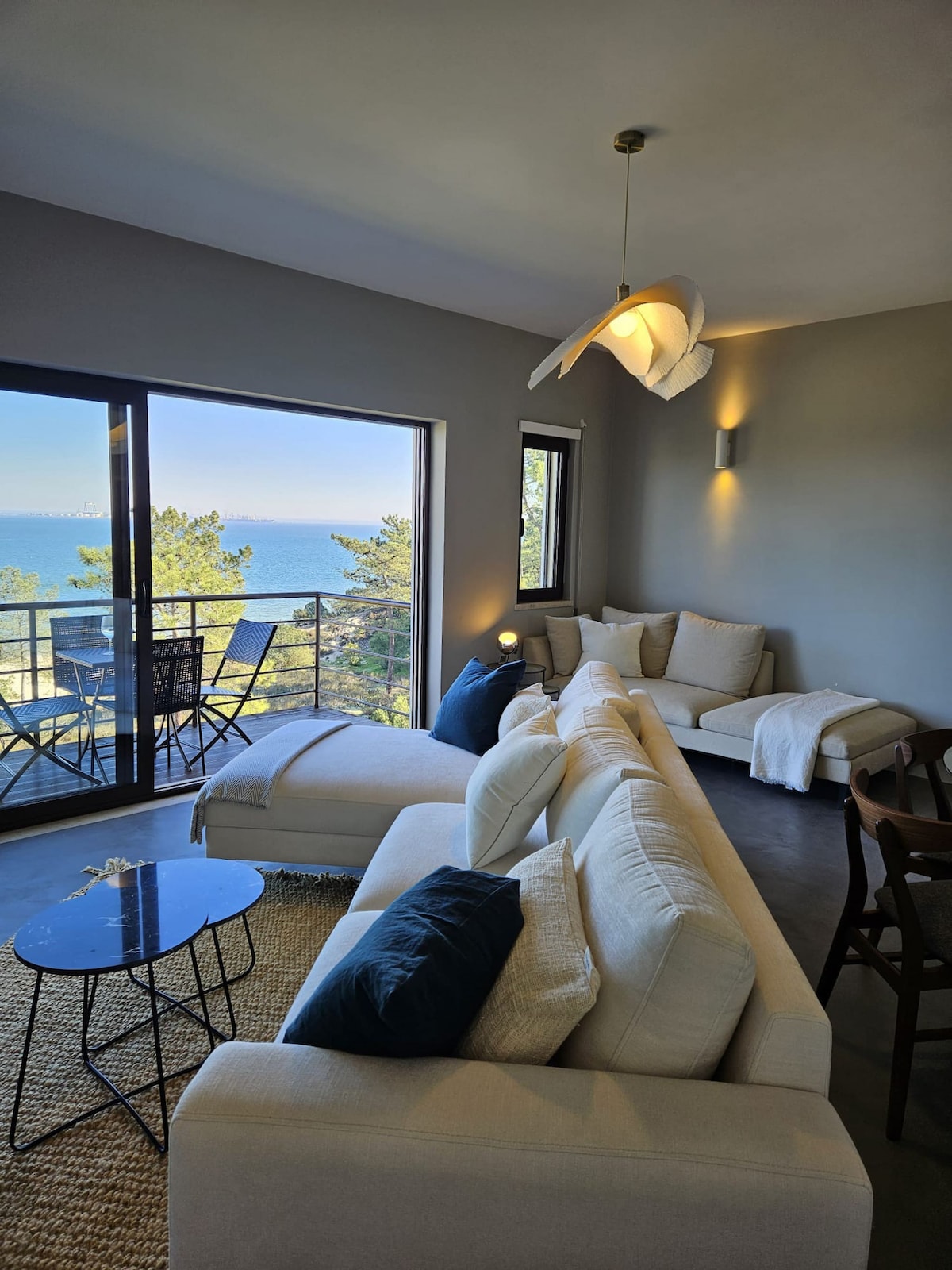 Apartamento reconstruído por arquitecto, excelente privacidade, exposição solar, com wifi, e praia a 150m. 1 suite com SPA e banho turco com aromaterapia. 1 suíte com terraço com vista mar, tela de projeção de cinema. Sala com vista de mar, rio, e terraço, onde poderá disfrutar de uma zona de estar e de um barbecue com grelha em ferro forjado. Perto de restaurantes, cafés e supermercado, e estação de comboio. Ar condicionado e piso aquecido em todas as áreas, TV 4K e box independente por suíte.