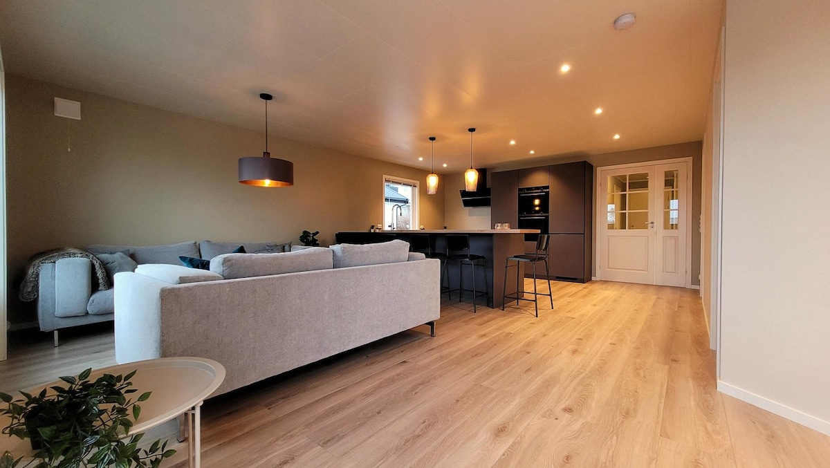 Cette maison individuelle spectaculaire conçue par un architecte dispose de 2 places de parking, d'une grande cuisine, de 2 salons, de 4 chambres avec lits doubles, de 2,5 salles de bain et de 3 espaces extérieurs ensoleillés pouvant accueillir jusqu'à 8 personnes. Le logement est orienté sud-ouest et fait un total de 180 m2. Il a un style scandinave moderne, lumineux et confortable. De là, vous pourrez profiter d'une vue magnifique sur les montagnes et la mer époustouflantes, ainsi que découvrir la lumière spectaculaire que nous avons dans le nord, toute l'année. À courte distance de la belle piste de ski de fond de Prestvannet (randonnée et colline de luge), du centre-ville et de l'aéroport.
