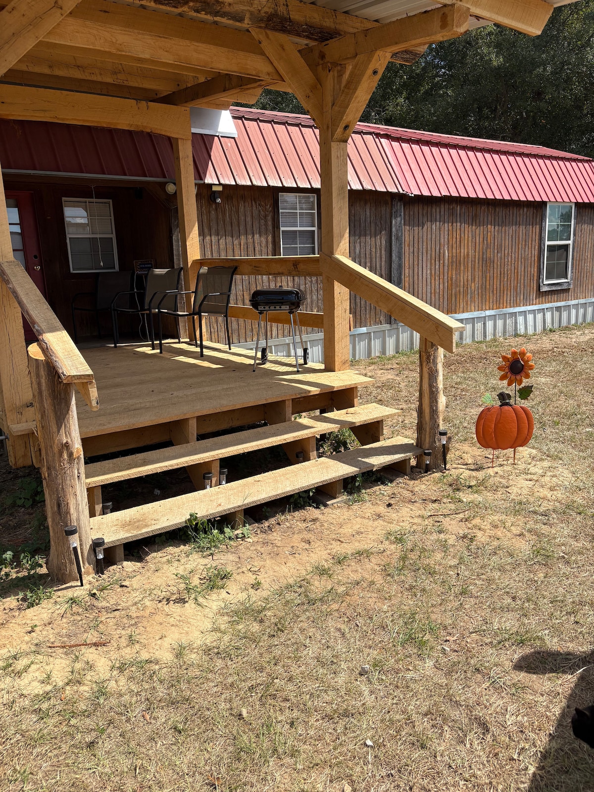 Cabane unique, primitive, d'une seule pièce avec baignoire et douche extérieures. Les toilettes extérieures comprennent un lavabo et des toilettes hors réseau. Promenez-vous dans la prairie, le verger de noix de pécan, la piscine et les étangs. Idéal pour la détente et l'expression créative. À vingt miles au sud de Montgomery, en Alabama, dans la communauté rurale de Fleta. Les propriétaires résident dans la maison principale sur place.