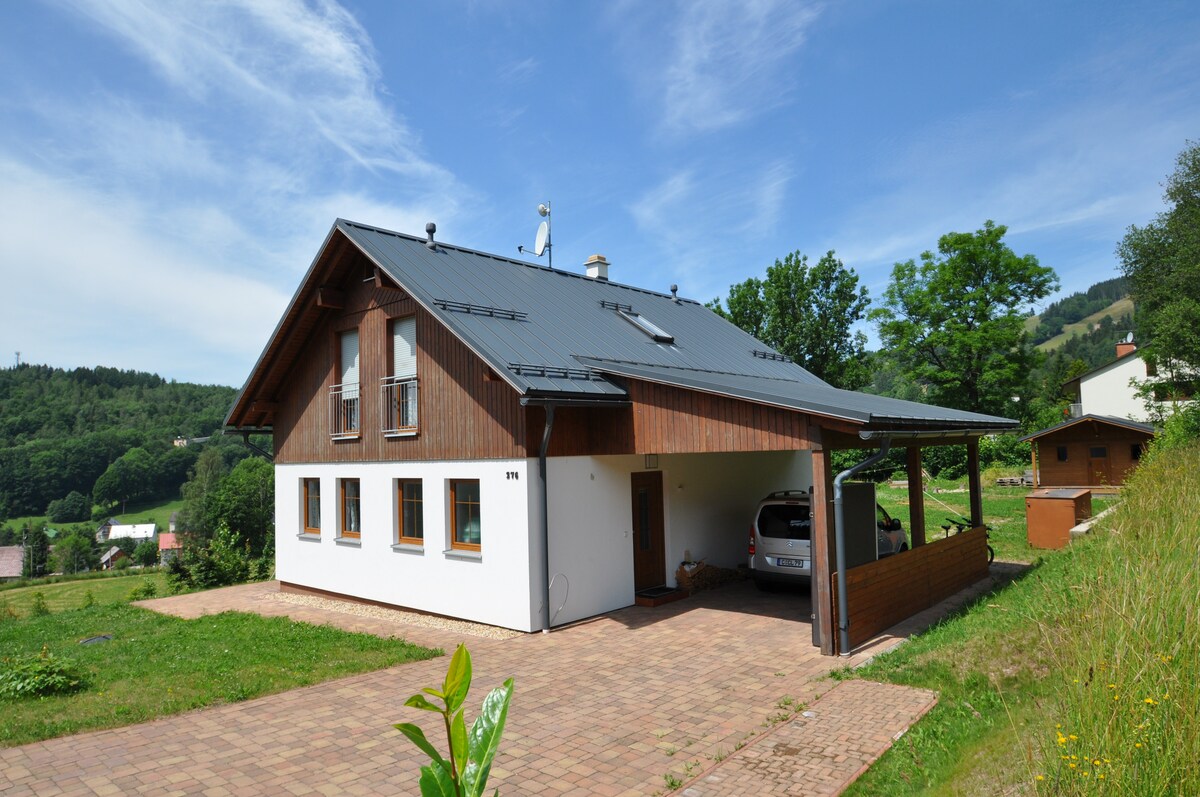 Nouveau bâtiment élégant à Horní Maršov dans les monts des Géants. Moderne et confortable, proche du centre du village et pourtant dans un endroit calme. Convient également à plusieurs familles pour toutes les saisons. En hiver, vous apprécierez la proximité de l’arrêt de ski-bus, du local à skis et du sauna, en été, le jardin avec salon extérieur couvert et la possibilité de se rafraîchir à l’intérieur. Vous pouvez utiliser toute l’année une cuisine moderne avec garde-manger, une télévision intelligente, un espace de rangement extérieur verrouillable, un espace avec des supports à vélos et d’autres avantages... Deux courts de tennis se trouvent juste en dessous de la maison.