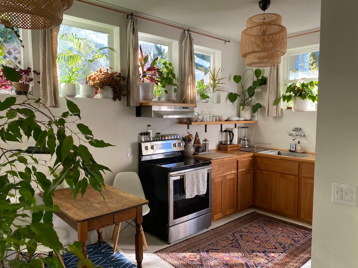 Studio au rez-de-chaussée baigné de lumière niché dans un quartier calme et magnifique. Ce charmant petit appartement présente des œuvres d'art originales d'artistes de Portland et est conçu pour la détente et le confort. Comprend une cuisine complète, une buanderie, une télévision connectée et un lit Queen Size avec matelas en mousse à mémoire de forme moelleux. Confortable, privé et serein ! Près de l'OHSU et du Lewis & Clark College.