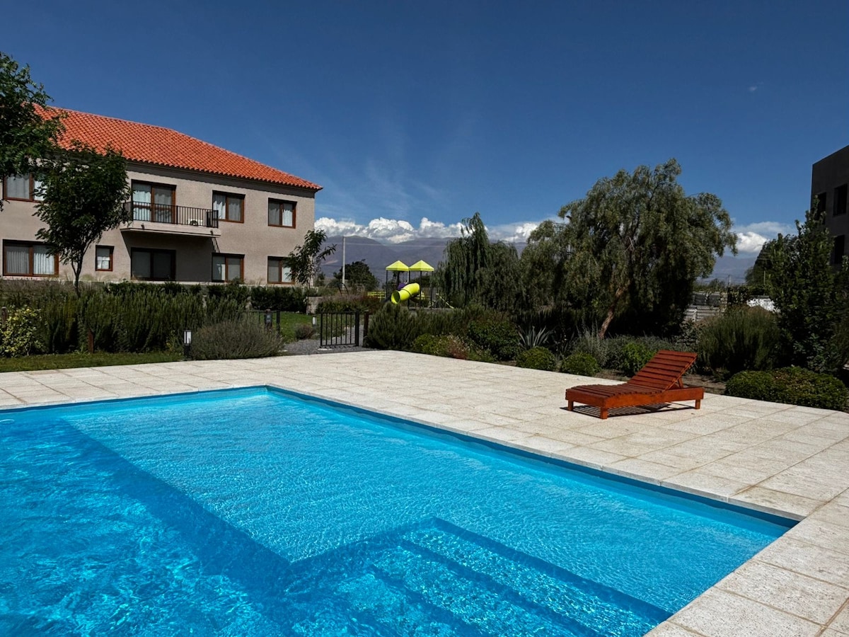 Découvrez le charme de Cafayate dans cet appartement de deux chambres du nouveau complexe Buena Vid. Profitez d'une vue imprenable sur les collines. Il dispose d'une chambre super king size, d'une chambre double, à la fois avec télévision connectée et climatisation. Avec une salle de bain complète, une demi-salle de bain, un salon avec télévision et Wi-Fi, et une cuisine bien équipée, il est parfait pour se détendre. Située au cœur de la ville, elle offre le meilleur de la commodité et des paysages à couper le souffle.