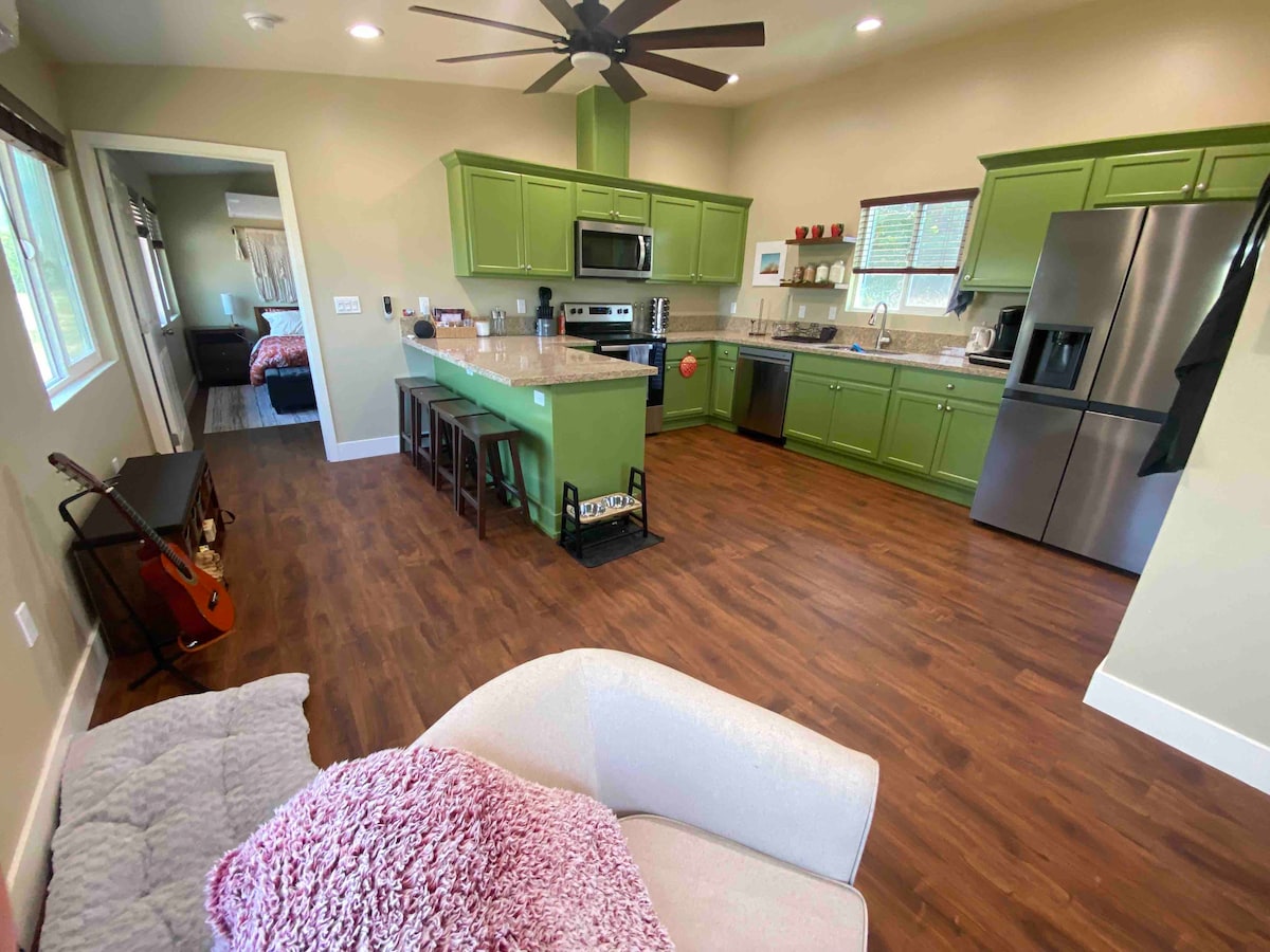 Notre luxueuse suite Kaweah Gem au bord de la rivière se trouve sur trois acres paisibles au bord de la rivière. Offrez-vous le meilleur de la région. L'attention portée aux détails est évidente dans cette suite nouvellement aménagée. À l'intérieur de la suite de 600 pieds carrés se trouve un lit Cal-King, une kitchenette et une énorme douche à double tête. À l'extérieur se trouve un patio privé avec barbecue. Une belle cuisine extérieure complète est également disponible pour les voyageurs. Et la rivière...wow, wow et WOW.