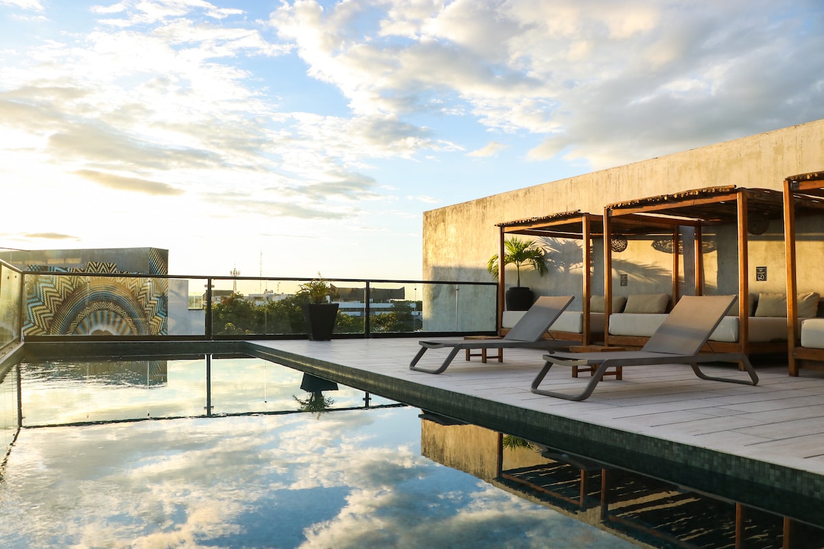 Lit King Size, piscine sur le toit, salle de sport et WiFi au centre de Tulum