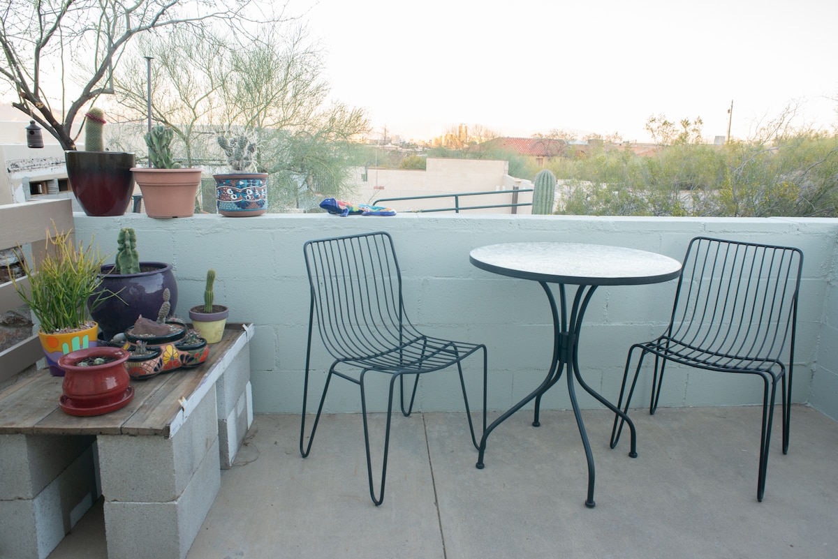 Vous recherchez le long terme ? ENTRÉE PRIVÉE paisible suite privée est une merveilleuse oasis en bordure du désert, calme et sereine. 5 minutes à 1-10, et randonnée Tumamoc, à 10 minutes de l'Université d'A et du centre-ville. Kitchenette entièrement équipée, salle de bain complète spacieuse et grande chambre. Rénové en 2018 avec un nouveau lit queen size « tout », un téléviseur HD 4K de 43", un grand placard. La cour paysagée dans le désert offre une vue sur la montagne, la ville et les patios. Quartier très calme. Un séjour préféré pour les voyageurs de longue et courte durée !