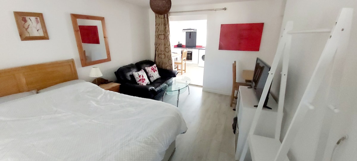 Chambre de jardin au rez-de-chaussée séparée avec porte d'entrée privée et stationnement hors de la route. Bon Wi-Fi, adapté aux ordinateurs portables. Lit simple uniquement (linge de lit fourni), armoire, TV/DVD, Wi-Fi, chargeurs de téléphone, câble Ethernet. Cuisine/salle à manger : évier, réfrigérateur, plaque de cuisson double INDUCTION**, micro-ondes, grille-pain, bouilloire, vaisselle, casseroles, couverts, torchons, huile d'olive, sel et poivre. **NB plaque de cuisson alternative disponible si vous avez un stimulateur cardiaque. Salle de douche : douche, évier, wc, porte-serviettes chauffant (serviettes fournies).