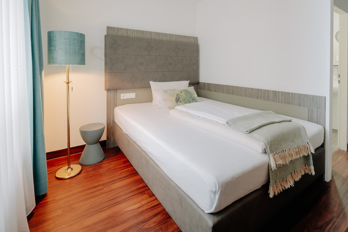 Nos appartements juniors sont situés dans le Weberei Bendix Hotel & Appartements et mesurent 30 m ², disposent de leur propre petite kitchenette avec four et réfrigérateur et d'une petite terrasse privée. Vous trouverez également dans cette chambre une table à manger et un coin salon. La chambre dispose également d'une connexion Wi-Fi, de la climatisation et d'une télévision IP. Vous pouvez prendre le petit déjeuner de l'hôtel tous les jours (moyennant supplément). Dans le même bâtiment se trouve également l'auberge du Bendix.