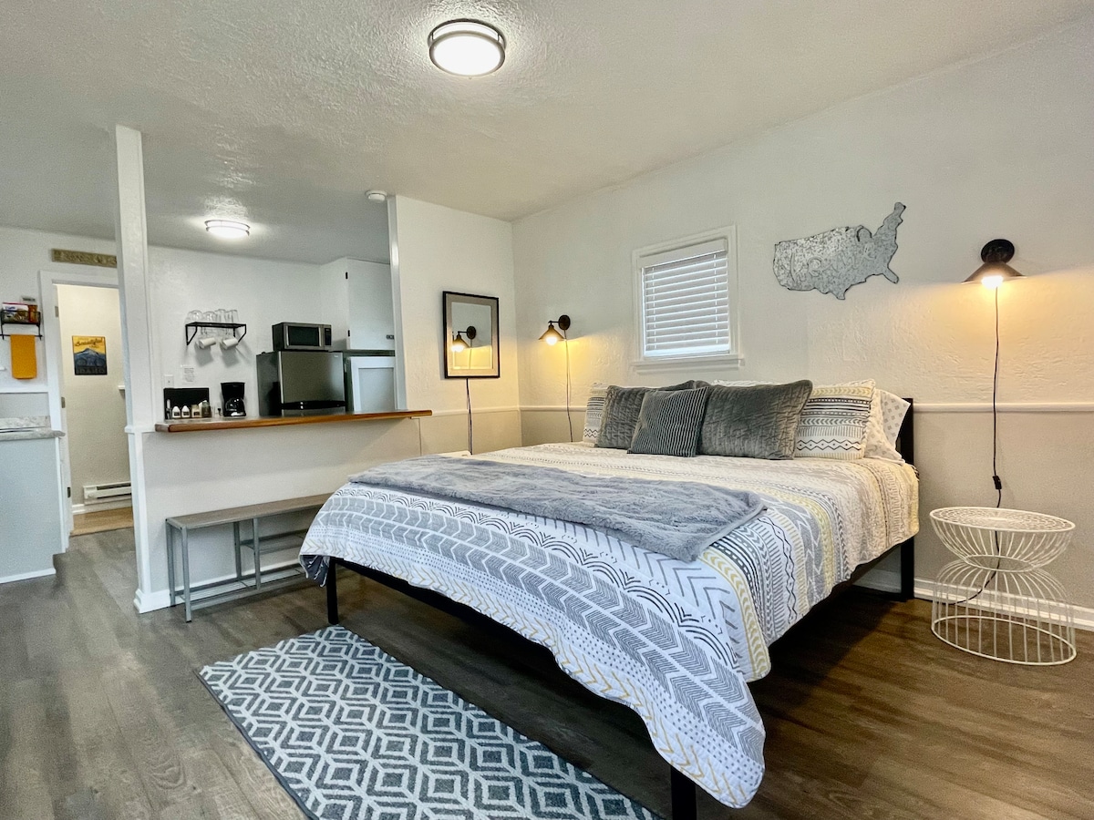 Nichée dans le prestigieux quartier de Settler's Ridge, cette suite moderne offre un logement central loin de chez vous dans la belle ville de Twin Falls. La suite dispose d'un salon ouvert avec tout ce dont vous avez besoin pour un séjour relaxant. Il y a une kitchenette, un coin repas chic, une salle de bain étincelante, un coin salon avec option canapé convertible et une chambre avec un lit King Size de luxe. Le célèbre Snake River Canyon se trouve à votre porte et d'excellents magasins et restaurants se trouvent à seulement quelques minutes.