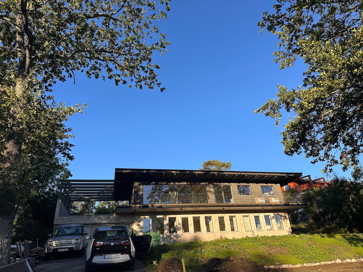 Maison privée récemment construite dans un emplacement surélevé avec terrasse à 2 minutes du bus (15 minutes de Gullmarsplan, 20 minutes de la ville de Slussen Stockholm). Parking inclus. Les draps, les linge de toilette, les consommables sont inclus. Télévision avec Chromecast. Lave-vaisselle et lave-linge. 5 min du lac de baignade, 15 min de la réserve naturelle. À 2 min de l'épicerie ouverte tous les jours du 08 au 22. 2 vélos sont inclus. Ville de Stockholm à 35 min, mer (mer Baltique) avec plage de sable, 30 min. Remarque : seuls les non-fumeurs sont autorisés en tant que voyageurs, car nous sommes allergiques.
