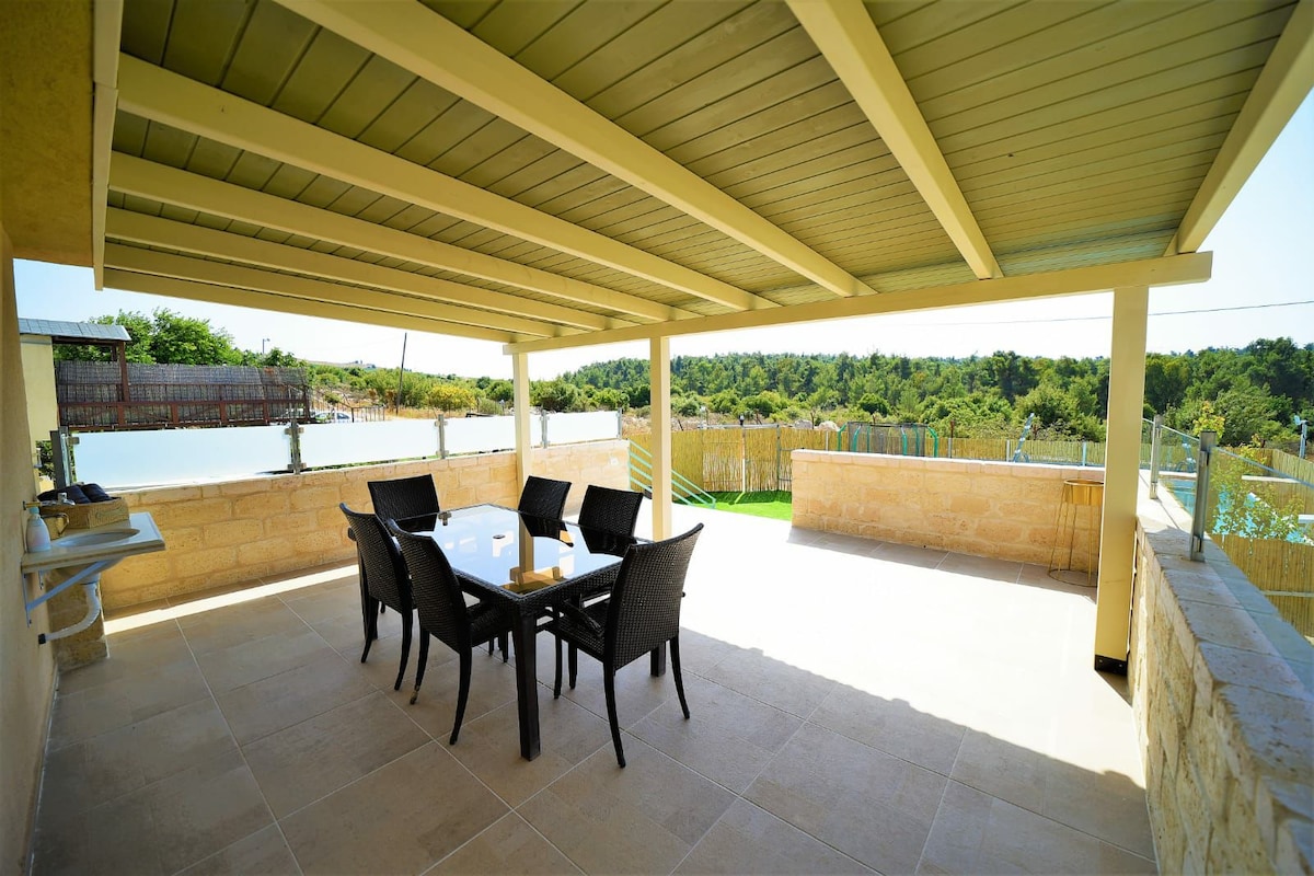 Une villa rustique et confortable est située dans un coin magique et calme, adapté aux familles et aux groupes toute l'année et aux couples en milieu de l'année. Notre villa est conçue avec douceur et goût. Les jours chauds, vous pourrez profiter d'une piscine privée de 32 m², d'un spa jacuzzi (40 degrés), de balançoires trampoline et de hamacs. Grand balcon donnant sur une vue incroyable. L'espace est privé et modeste. Excellent emplacement pour la randonnée dans la forêt adjacente à 2 km du Saint Tana Rabbi Shimon Bar Yochai, du mont Meron et d'autres belles destinations Jusqu'à 14 personnes peuvent être hébergées dans le confort de Bar Yochai, une colonie religieuse nationale. Prix de base pour 10 personnes, 8 voyageurs et chaque personne supplémentaire