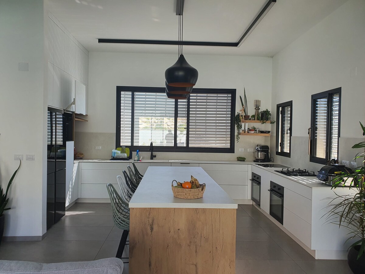 Une nouvelle maison, spacieuse et propre, lumineuse, charmante et confortable à Kibboutz Amir, à quelques minutes à pied du Jourdain. 3 chambres (une avec salle de douche privée et trois avec lits doubles), une cuisine spacieuse équipée de tout ce dont vous avez besoin, un salon intime, un balcon avec un coin salon confortable entouré d'un jardin. Grande cour avec un sauna sec. Le logement comprend l'entrée à la piscine du kibboutz pendant les mois d'été. La maison est préparée pour accueillir jusqu'à 8 personnes, y compris les enfants et les bébés. La maison dispose de dimensions standard. Ariela Elik Lev
