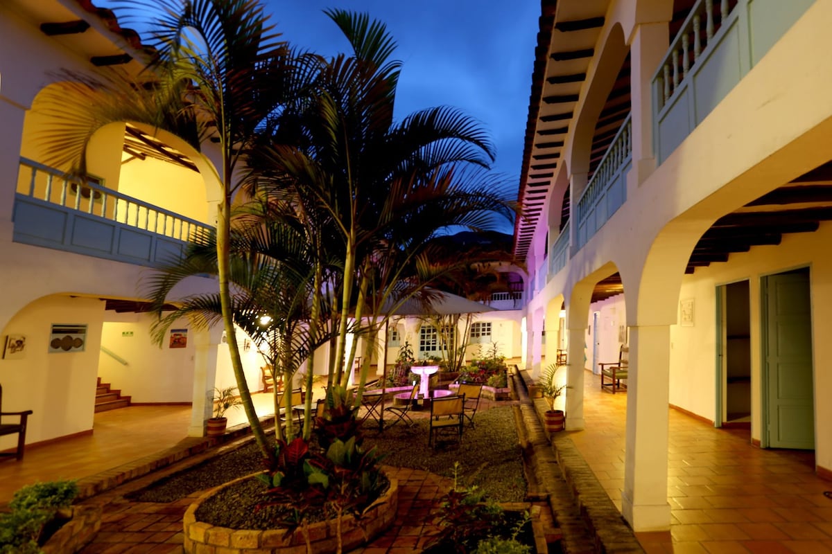 Cette jolie chambre est située à Casa Pancha Mama avec un excellent emplacement à seulement deux pâtés de maisons de la place principale. Il est idéal pour un couple de passer quelques jours romantiques à explorer la charmante Villa de Leyva. Elle est spacieuse et confortable avec un lit deux places et un banio complet . La chambre a une belle vue sur la cour de la maison et les montagnes. Un délicieux petit déjeuner est inclus dans le prix de la chambre.