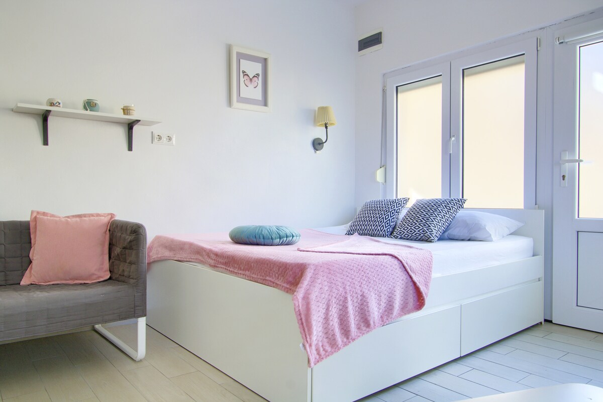 VIEILLE VILLE à 5 min à pied ! PROMENADE EN BORD DE MER à 1 min à pied ! PARKING gratuit ! Quartier familial et sûr ! DÉTENTE 2 chambres + coin salon avec canapé-lit confortable, cuisine bien équipée, BALCON ensoleillé. BEAUCOUP DE LUMIÈRE NATURELLE. Salle de bains/toilettes séparées. WIFI de qualité et gratuit. À MOINS DE 100 m : supermarchés, boulangeries, banque, pharmacie, restaurants, arrêt de taxi et de bus ... et le beau parc Vruljica pour les ENFANTS (moulin à eau, canards, balançoires, bac à sable). TERRAINS DE SPORT modernes Višnjik, à 15 min à pied. PLAGE à 25 min à pied ! BIENVENUE :))