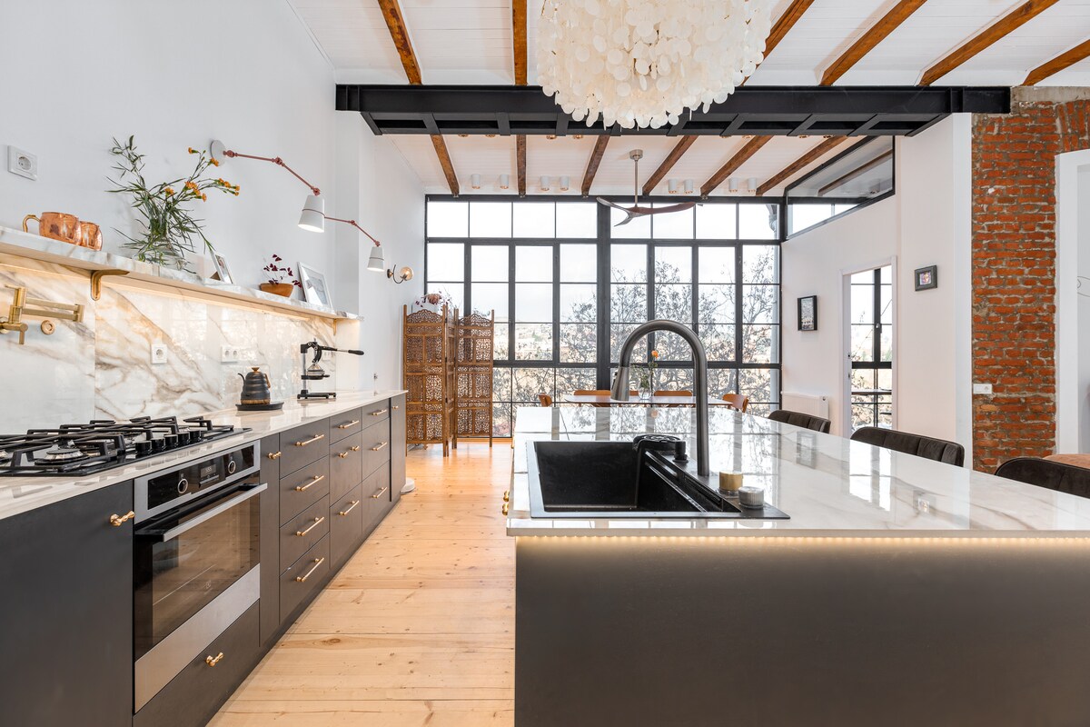 Appartement loft élégant au dernier étage dans le centre même d'une partie historique de Tbilissi. L'appartement peut vous offrir une belle terrasse avec une vue fantastique, une cheminée confortable, une grande chambre, la climatisation, une salle de bain avec baignoire et une autre salle de bain avec douche et un lave-linge. L'appartement est adapté pour quatre personnes. À distance de marche, vous trouverez de nombreux cafés, bars, restaurants, sites historiques, célèbres bains de soufre et un magnifique jardin botanique.