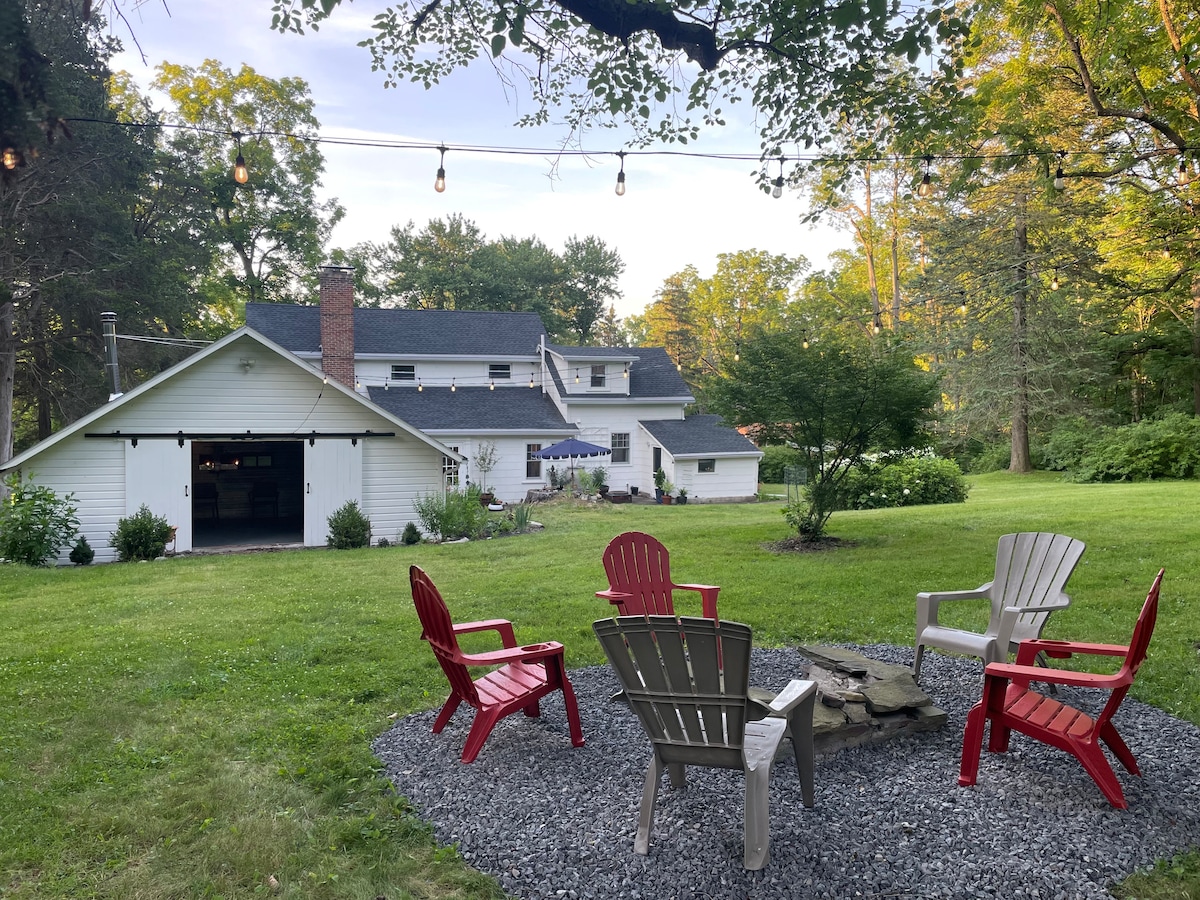 Découvrez le luxe à Barn Manor, une grange reconvertie entourée de champs et de forêts. Détendez-vous dans une baignoire à jets avec chauffage au sol, profitez des soirées au coin du feu et admirez les boiseries sur mesure, les touches de marbre, le hamac intérieur et les fenêtres uniques. Les deux niveaux sont des plans d'étage ouverts : le premier étage dispose d'un lit Queen Size, d'une cuisine complète, d'un espace de vie et d'une salle de bain ; l'étage offre un lit King Size avec matelas Casper, un futon Queen Size et un lit jumeau pliant en option. Peut accueillir jusqu'à 8 personnes. Renseignez-vous sur les séjours longue durée en hiver.