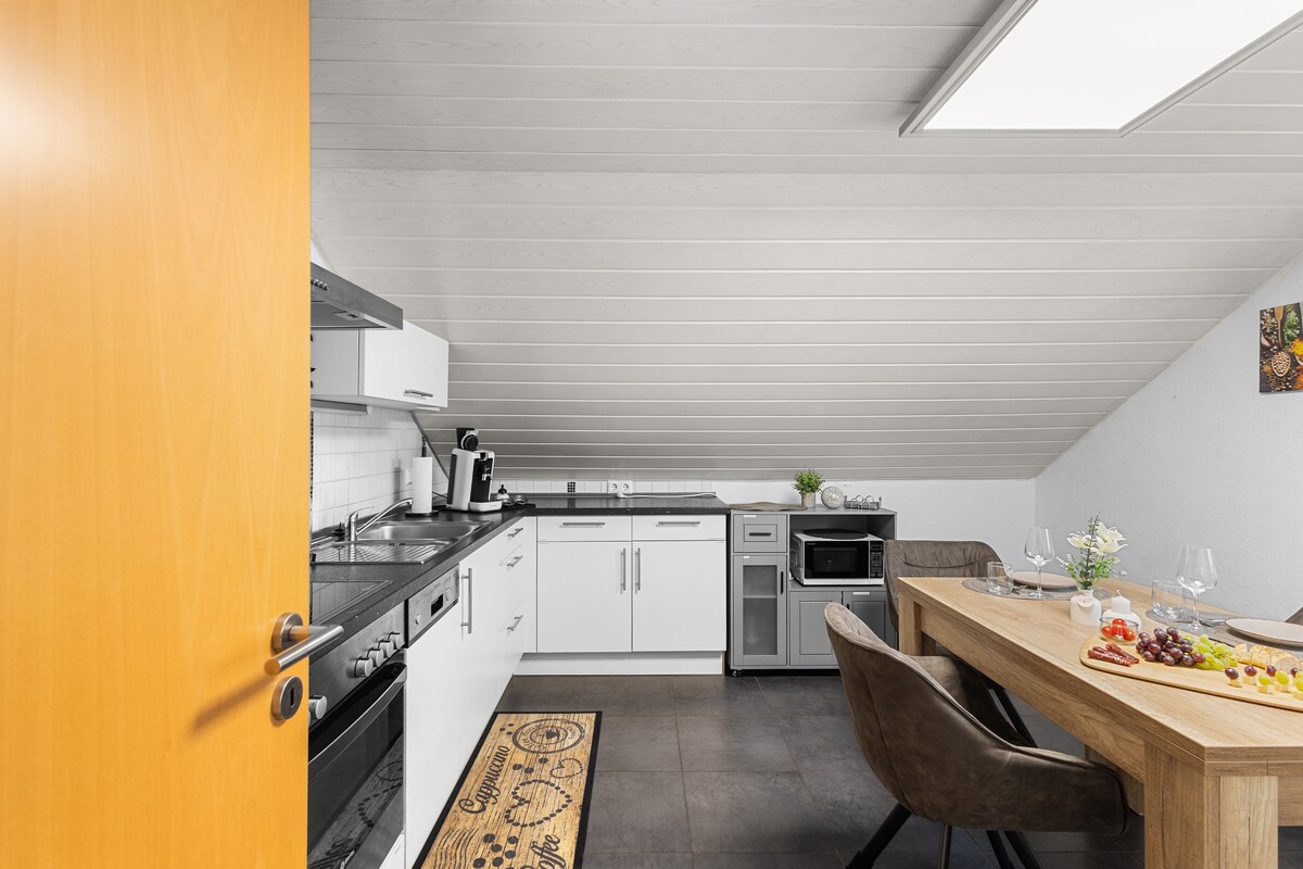 Appartement de 2 pièces et demi d'une beauté exceptionnelle avec une vue unique sur la vieille ville de Biberach et la vallée de Wolfental. Confortable et équipé de meubles design de haute qualité. Grande cuisine-séjour, entièrement équipée, entre autres avec lave-vaisselle. Balcon avec vue panoramique à usage exclusif et terrasse sur le toit verdoyante au sud à usage commun. Télévision par câble, wifi rapide de 54 Mbit. Quartier résidentiel très calme et privilégié dans la verdure. 10 minutes à pied du centre-ville, 5 de l'université.
