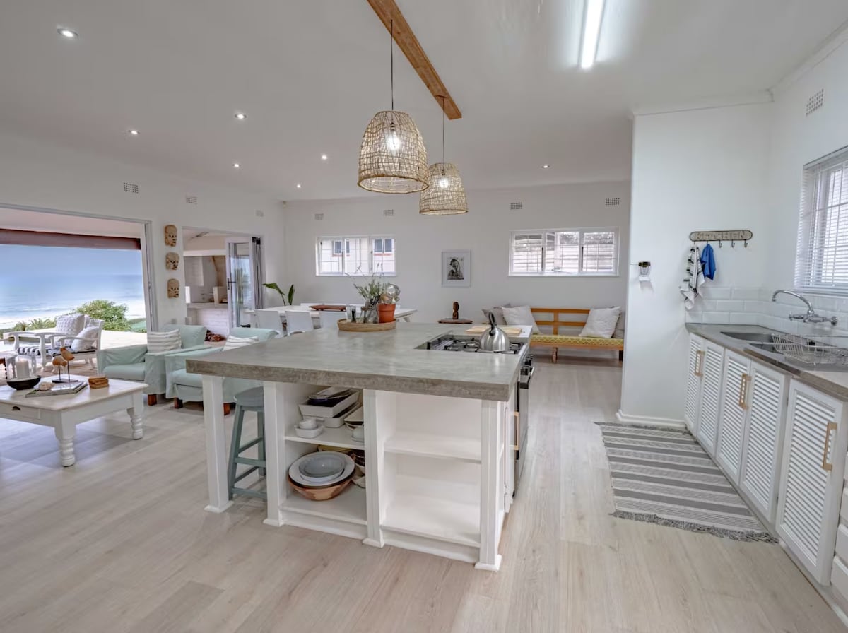 Un appartement moderne, exquis et récemment rénové, tout à vous, avec une vue imprenable et un accès direct à la plage. Équipé d'un onduleur et d'une cuisinière à gaz pour le délestage. Cette maison de 3 chambres est spacieuse et aérée et vous offre l'une des vues les plus magiques sur l'océan Indien. Observez les baleines depuis votre canapé et admirez le lever du soleil dans le confort de votre lit. Situé dans un domaine sécurisé avec des courts de tennis, une salle de sport, des trampolines, des installations de braai, vous pourrez profiter des vacances à la plage ultimes.