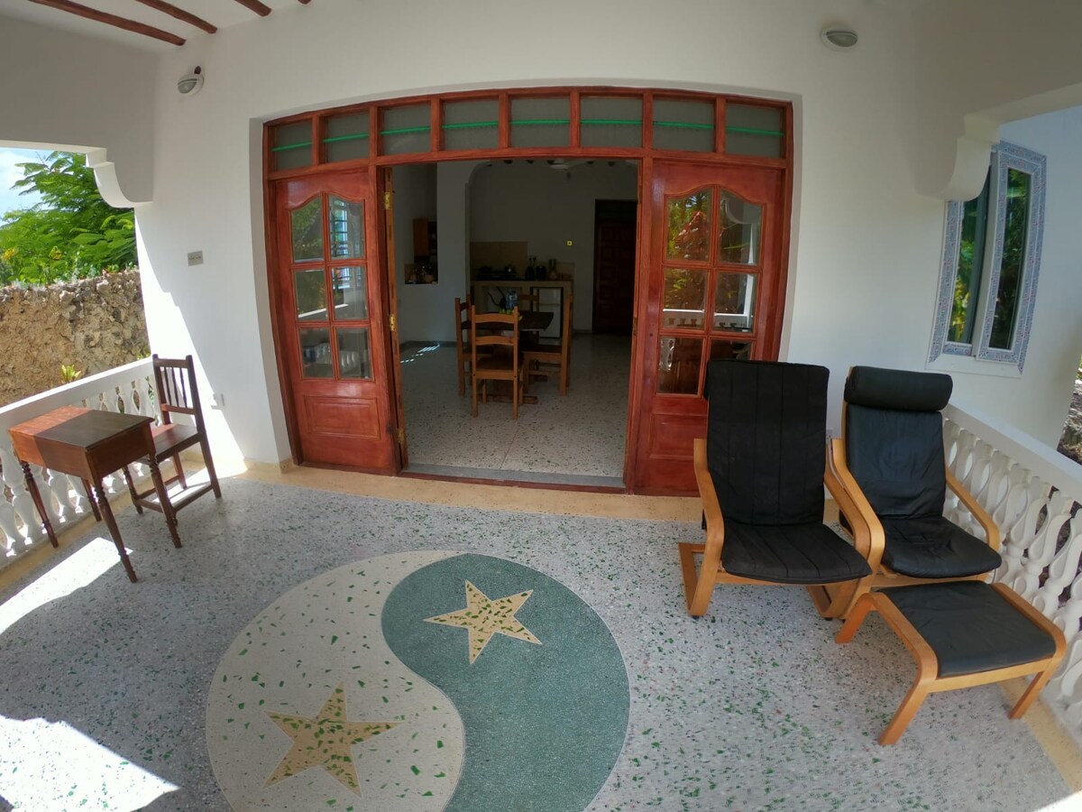 Évadez-vous dans notre maison d'hôtes tranquille nichée dans la brousse de Zanzibar. Deux chambres spacieuses et lumineuses offrent une salle de bain privée, un balcon/patio et une entrée. Les chambres disposent d'un lit de grande taille pour un confort ultime. Partagez notre cuisine extérieure, notre jardin et notre coin salon couvert. Notre salle de sport est située à proximité (5 minutes à pied) ; des cours de yoga, de danse, de boxe et de fitness sont disponibles. La belle plage avec des restaurants se situe à 10 minutes à pied. Découvrez la sérénité et la commodité au paradis.