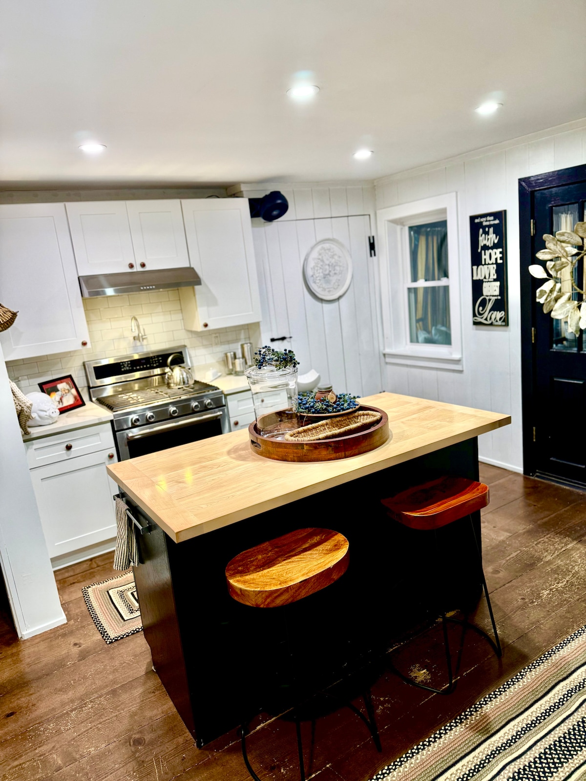 Second floor of an 1865 Tin shop, industrial building. High, open beam ceilings & exposed brick walls. Bathroom features a soaker tub plus a lux walk in shower. The kitchen features quartz counters, a large farmhouse sink, really nice appliances and thoughtful touches everywhere. The wifi is excellent. Have issues with stairs? This is not a good choice for you. If you're up for stairs and want a unique slice of history in a hip package then you will not be disappointed.