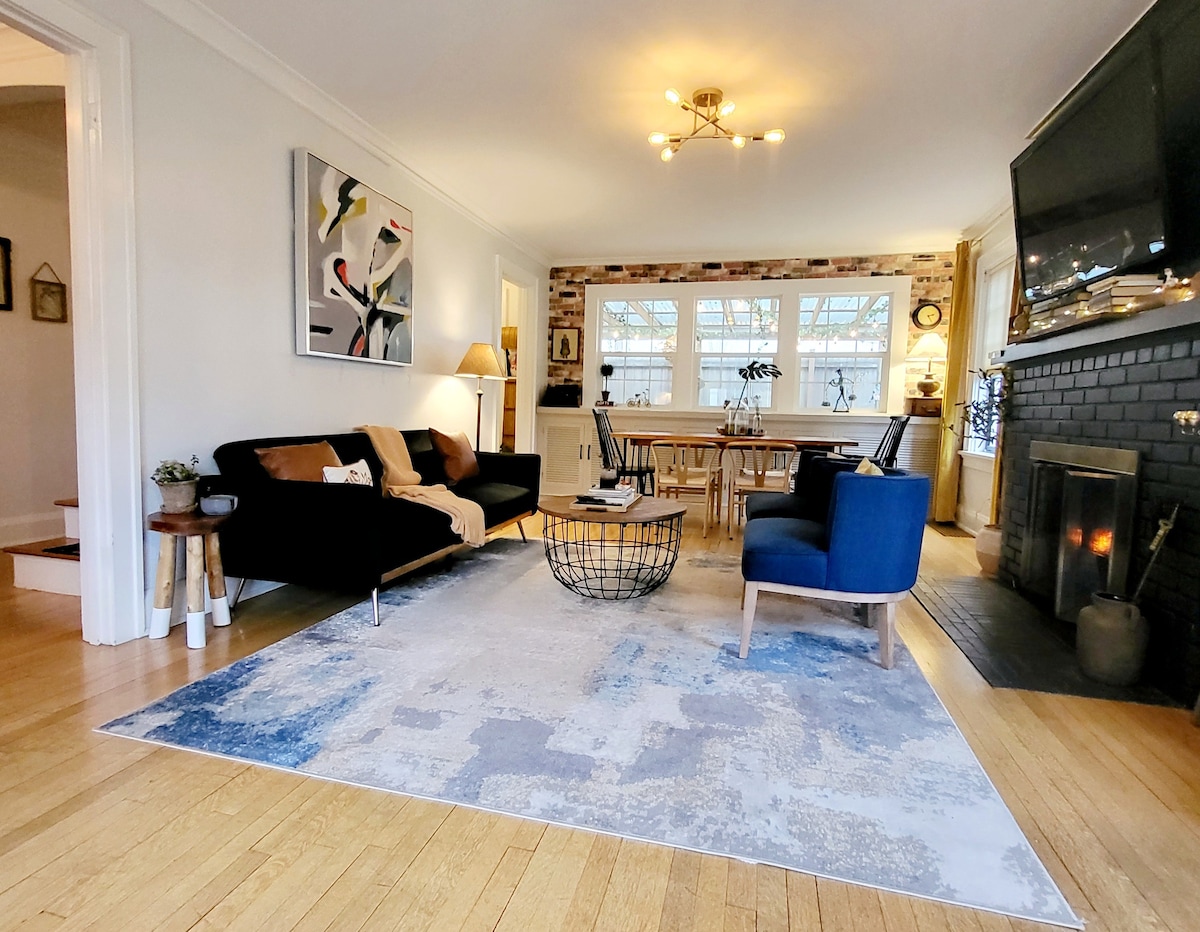 Profitez d'un lit King Size ou Queen Size confortable dans une maison moderne et unique des années 1930. Faites comme chez vous avec une cheminée en briques, une cuisine complète avec cuisinière à gaz, un coin cuisine intégré et un espace bureau. Admirez la rue bordée d'arbres depuis le grand porche privé recouvert d'un ancien rosier miniature sans épines. Prenez le déjeuner ou profitez d'un après-midi entre amis ou en famille au Bistro à côté ! Marchez ou faites du vélo à quelques pâtés de maisons du centre-ville, de l'université ou du bus pour vous rendre aux boutiques, restaurants, concerts et jeux !