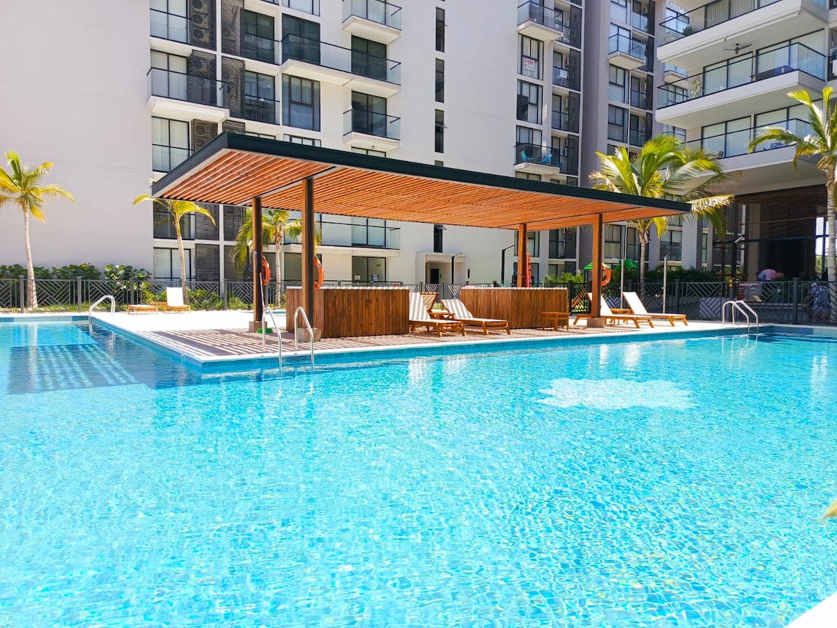Pour les couples et les familles à la recherche du meilleur emplacement. Un lieu avec toutes les installations d'une maison et le confort d'un hôtel. Piscine spectaculaire avec bar, restaurant, salle de sport et jeux pour les enfants. Vous serez à seulement quelques pas de la meilleure plage et le prix de votre séjour comprend des parasols, des chaises et des serviettes. De l'appartement, vous pouvez marcher jusqu'au supermarché et à une grande variété de restaurants dans le centre commercial Zazué. Le centre-ville est à 10 minutes de taxi.