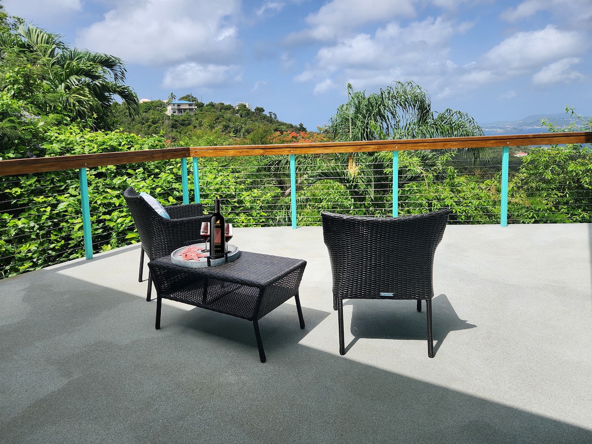 Parrot's Perch , a spacious ocean facing suite and a division of " DreamView On The Hill ". This hill top villa is an enchanting 1 bed/1 bath guest suite offering gated parking and pathways illuminated by solar lights. Inside, discover Cathedral ceilings, AC, kitchenette, and king bed. We utilize self-sustaining solar panels. Immerse yourself in the mesmerizing natural beauty that envelops you and relish the awe-inspiring views. Conveniently situated just 3 miles away from Cruz Bay.