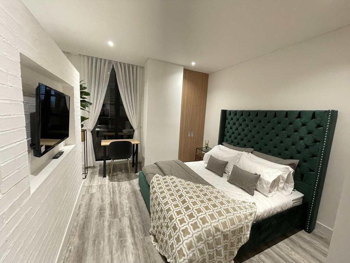 Luxueux une chambre dans le quartier le plus exclusif / sûr de Bogota (Chico) à distance de marche des meilleurs restaurants, centres commerciaux et à proximité de nombreuses entreprises. Logement de niveau exécutif avec espace de travail dédié, terrasse privée, cheminée automatique, wifi fiable, parking privé et sécurité de l'immeuble. Ameneties : Profitez de la belle terrasse panoramique avec foyer et barbecue extérieur. Jouez également au squash et détendez-vous dans le sauna ou le hammam.