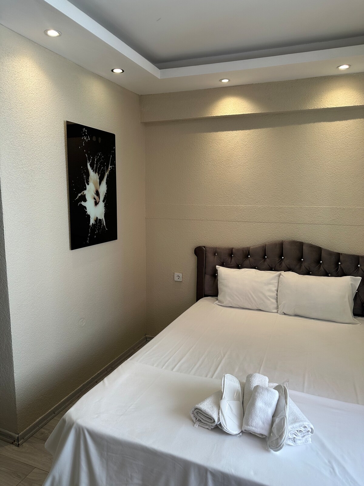 This unique apartment is in our modern boutique hotel in Ortaköy, Istanbul, just a 2-minute walk from Ortaköy Coast, the iconic Bosphorus Bridge, Ortaköy Mosque, and popular kumpir and waffle shops. It features a spacious bedroom, a living room, and a private backyard garden fully furnished for outdoor relaxation. With two air conditioners, a fully equipped kitchen, a washing machine, and a 40-inch TV, the luxurious and modern design ensures a comfortable stay for two guests.