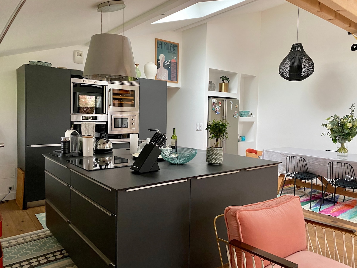 Résidence principale mise à disposition. Appartement atypique sous les toits avec poutres apparentes traversant T3 de 55m², salon avec cuisine ouverte de 30m² lumineux de deux Velux avec volets. Il dispose de deux chambres, idéal pour se ressourcer entre océan et montagne. Parfait pour les amoureux de nature et de tranquillité. Emplacement à 20 minutes des plages et des montagnes. J'essaie de rendre votre séjour le plus agréable, n'hésitez pas pour toutes questions.