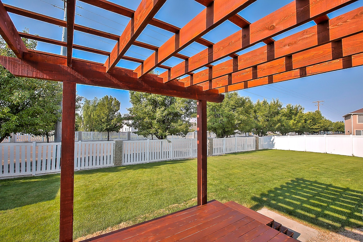 La chambre principale dispose d'un lit très confortable et réglable et d'une télévision connectée. Il y a des rideaux qui éteignent la lumière. Le dressing principal a beaucoup de tiroirs et d'espace de penderie. Les deux autres chambres sont équipées de matelas confortables en mousse à mémoire de forme. Il y a une salle de bain séparée. La cuisine est entièrement approvisionnée et comprend une excellente cuisinière à gaz. Il y a une machine à café Keürig. Nous nettoyons et assainissons à la vapeur pour vos bienfaits pour la santé. La cour arrière est belle et familiale. Venez vous détendre et profiter de cette magnifique maison sur le thème de l'Utah