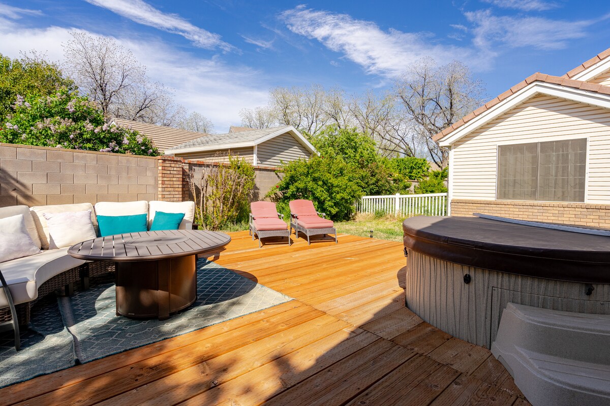 Maison d'hôtes neuve de 750 pieds carrés ! La maison elle-même est un pur paradis ! Mon mari et moi l'avons construite dans un souci de luxe. Tout est neuf !! Dans un joli cul-de-sac résidentiel ! Il y a un ruisseau de l'autre côté de la rue et un parc avec un barbecue à côté ! Si vous n'avez pas vu le ciel nocturne en dehors d'une grande ville, vous allez vous régaler ! Il y a de belles vues au sud et des randonnées tout autour. Comprend une terrasse arrière avec JACUZZI, barbecue, table de feu et sièges juste à côté de la suite principale !