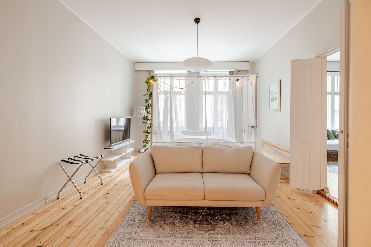 Cozy place in most beautiful and peaceful neighbourhood! 2 blocks from sea & park. Bathroom newly renovated (2024). Scenic 15 min walk to center and tram/ bus/ citybike. Two airy rooms all to yourself. High ceilings and windows. Quiet, harmonic. Well equipped kitchen. King size bed. You won’t find a quieter bedroom! Top fourth floor in Art Nouveau building. Islands, cozy restaurants, design district, boutiques nearby. No elevator. Fast internet. Grocery store 2 min. Happy to help!