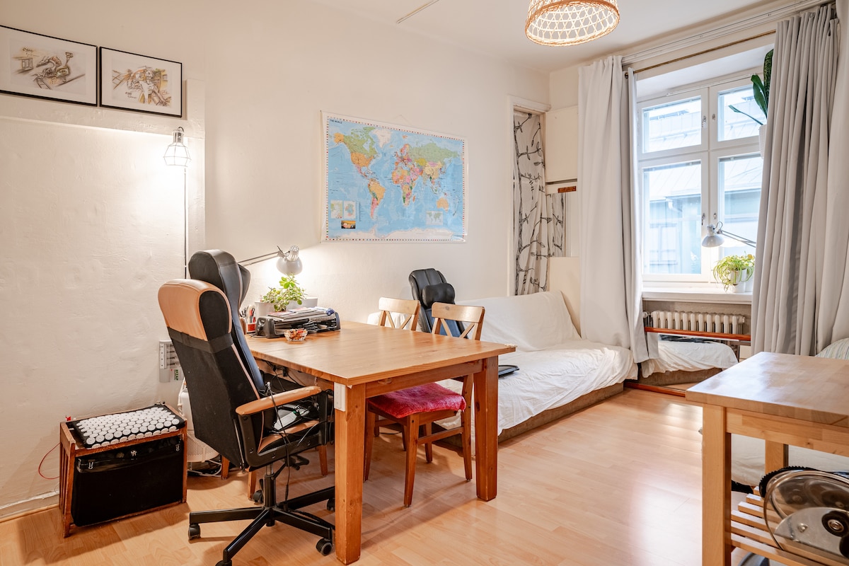 26m2 mini comfy AI self-service Studio in the liveliest area: Kallio. Metro @ 50mt Helsinki Train Station @ 1.8km LAUNDRY Like the rest, it´s Self-service. BIKES 5x Enjoy fantastic bike paths in Helsinki´s nature. BREAKFAST You will find a few items as coffee & tea for the first morning, it may vary URBAN Many bars, cafes, etc. Artists & eclectic folk around SAUNA (LARGE) A private shift in the building's sauna. Available on specific days (ask me for details) PROJECTOR Like @ cinema