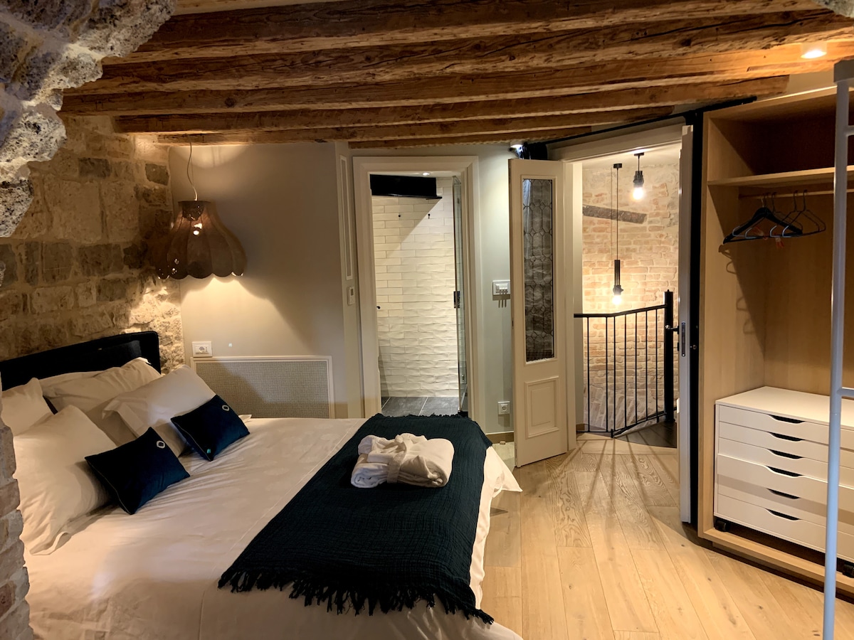 Réveillez-vous sous les poutres apparentes de plafonds en bois centenaires. Laissez-vous charmer par les touches anciennes, les escaliers de style industriel et les finitions raffinées nichées derrière les vastes arches intérieures en pierre du palais impérial. Imprégné d'histoire, buvez un verre de vin sur le balcon de ce loft unique après avoir exploré les délices de Split, où des pièces de musée ornent une palette de sable et de teintes terreuses discrètes.