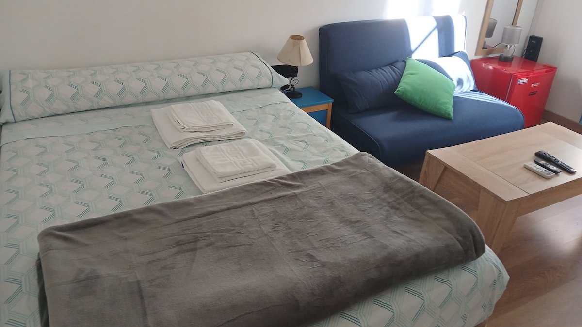 Studio confortable et avant-gardiste récemment rénové. Design moderne dans quartier calme. Avec tout ce dont vous avez besoin dans les environs, supermarchés, ligne de bus et métro à proximité. * Grand lit de 150 x 190 * Pompe à froid et à chaleur de grande qualité * Salle de bain complète avec douche * WI-FI, Télévision * Récemment rénové, air moderne * Option de parking disponible (il est nécessaire de la demander)