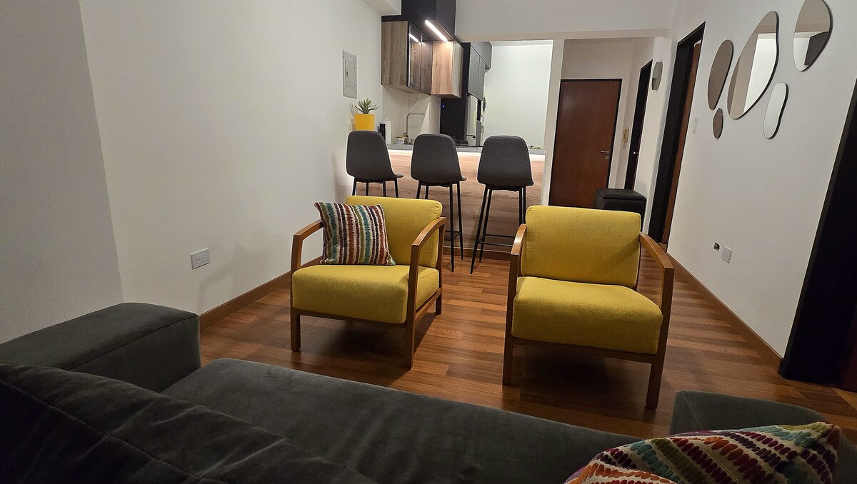 Profitez d'un séjour calme et confortable avec votre famille dans cet espace conçu pour le repos. Un endroit confortable, fonctionnel et avec des détails pensés pour que vous vous sentiez comme chez vous dès le premier instant. Le logement dispose d'un salon spacieux et confortable, équipé d'un canapé lit et une Smart TV de 50", idéale pour des soirées cinéma ou séries. Sur un côté, vous trouverez une salle à manger confortable, avec une belle vue sur la ville, qui se connecte parfaitement avec la cuisine.