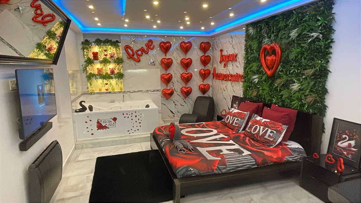 ❤️🔥 Découvrez la Love Room VELVET & LEATHER à seulement 20min de Paris, idéale pour une escapade romantique et sexy ! 💎 Baignoire balnéo, sauna privé, lit king-size effet nuage, barre d'effeuillage, sofa tantra, etc. 💋 Explorez de nouvelles sensations et créez des souvenirs inoubliables à deux dans l'espace secretroom incroyablement équipé 🎬 Cinéma avec Netflix, Prime Vidéo, Disney+ et Spotify 💫 Évadez-vous dans un havre de paix et de luxe pour une expérience unique et mémorable !