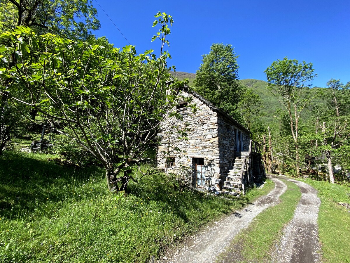 Due case in pietra immerse nel bosco, nel piccolo nucleo "Gropp", raggiungibili dal posteggio in 18 minuti a piedi lungo una strada pedonale asfaltata di cui gli ultimi 10 minuti un sentiero nel bosco leggermente in salita. Dedicati a chi ama la natura, a chi sa apprezzare la tranquillità, la vita semplice, a chi non si scoraggia se di notte sente gli animali del bosco aggirarsi, a chi si incanta ad ascoltare gli uccelli e a chi ama i bagni nelle magnifiche pozze azzurre del fiume Maggia.