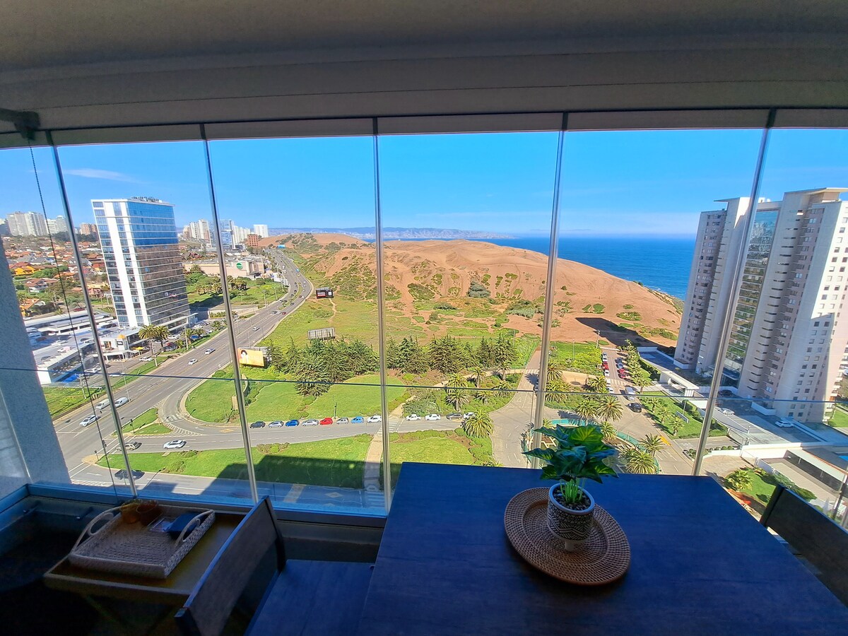 Venez profiter du confort de ce nouvel appartement avec une belle vue sur la ville de Concón. Nous avons un excellent emplacement à quelques pas des supermarchés, des restaurants, du parc avec des jeux pour enfants, des plages et des dunes. L'appartement dispose de : ✓ Lit Queen avec matelas drimkip (mousse à mémoire de forme) ✓ Wifi haute vitesse Télévision ✓ connectée ✓ Terrasse ✓ Chauffage, plaque de cuisson et four électriques ✓ Parking Le ✓bâtiment dispose d'un kiosque, d'une salle de jeux, d'une piscine extérieure et d'une buanderie. Bienvenue !