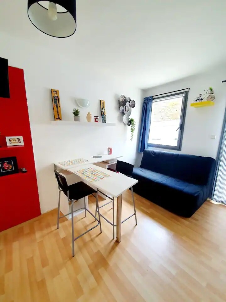 La cachette Perdue, A 300 mètres de la plage, du port, ce petit T1 bis atypique, bénéficie du nécessaire pour se détendre en couple. Mini hammam dans la douche, baignoire balnéo 2x places (qui vient en remplacement du bain nordique sur la photo 1) , home cinéma 5.1 dans la chambre. *Pour passer un agréable séjour en été comme en hiver, nous prêtons sans supplément deux vélos. Ils sont prêtés à titre gratuit. ⚠️ logement déconseillé pour les personnes de plus de 60 ans et pour les bébés.