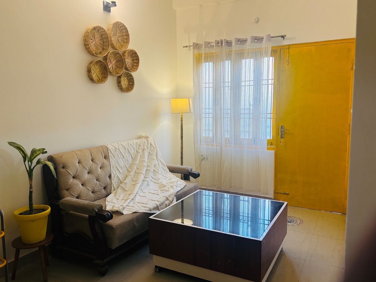 Vous disposerez d'une chambre de 120 pieds carrés avec un lit double et 1 canapé-lit avec une salle de bains privative et un balcon attenant. Le salon commun et la cuisine commune entièrement équipée sont reliés par un salon commun et partagés avec d'autres voyageurs. C'est un appartement 2BHK entièrement entretenu. Parfait pour les voyageurs en solo, les couples et les voyageurs qui travaillent de n'importe où. C'est un endroit économique pour vous et votre famille.