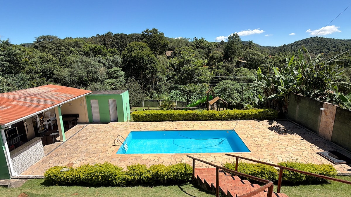 Chalet simple mais spacieux et aéré, contenant un balcon, un espace barbecue, un four à bois, une piscine avec marches et un champ de pelouse pour les loisirs. Plus de 20 000 m2 de forêt indigène, avec pelouse, sentiers, arbres fruitiers et animaux sauvages. Proche de Cotia, Caucaia do Alto et Vargem Grande Paulista, à environ 40 minutes de São Paulo. Attractions à proximité : PetZoo, BichoMania et le futur Animalia Parque, qui vise à être le plus grand parc d'attractions d'Amérique latine.